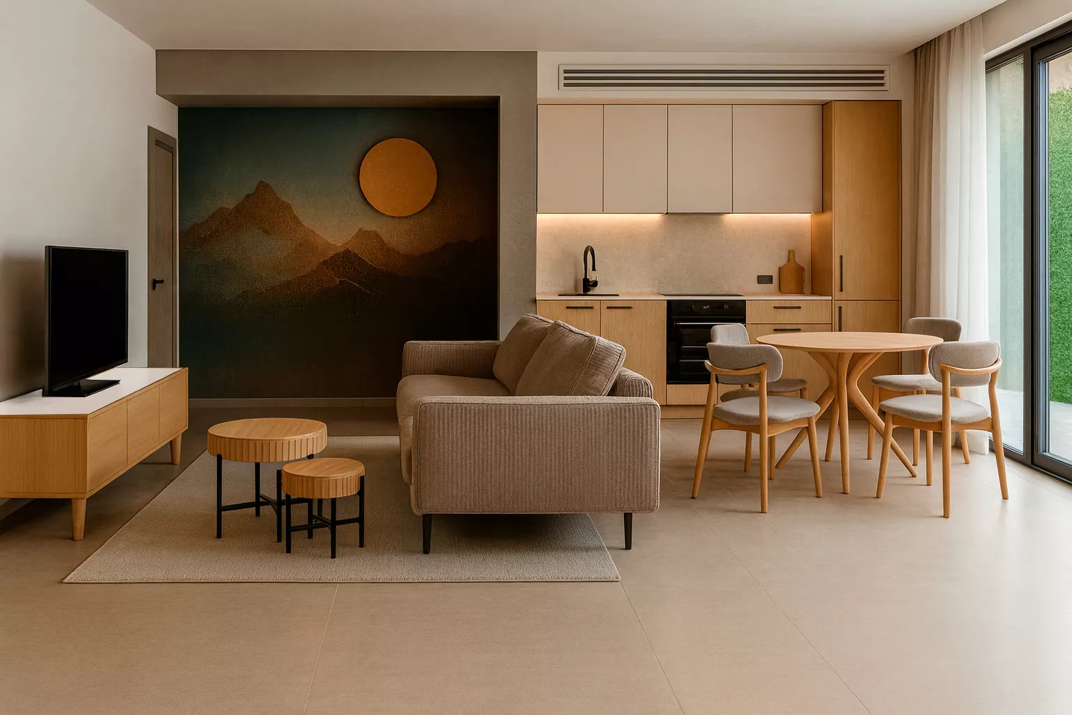 Round, Solid Wood, Natural Oak, Matte Finish, Diameter: 120cm, Height: 77cm.