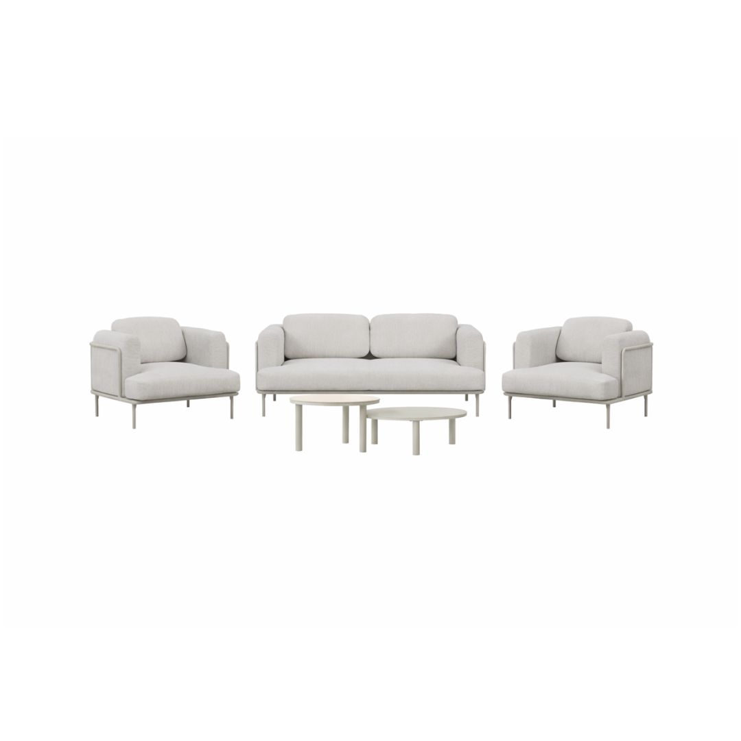 Modern aluminium outdoor set in sunproof grey with a 2-seater sofa, two armrests, two stylish coffee tables, and weather-resistant olefin cushions for superior outdoor comfort.
