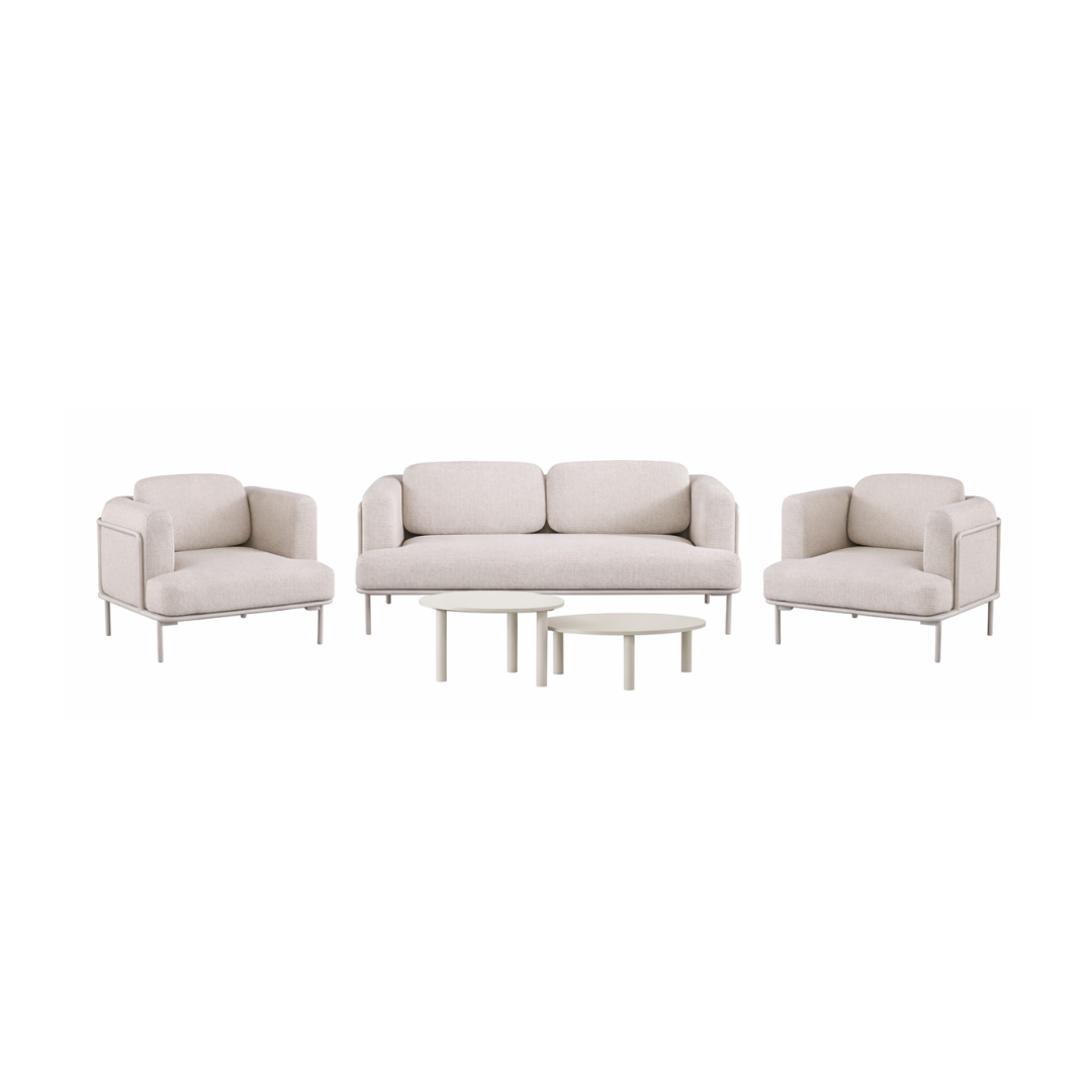 Modern aluminium outdoor set in sunproof beige with a two-seater sofa, lounge chairs, stylish coffee tables, and weather-resistant olefin cushions for superior outdoor comfort.