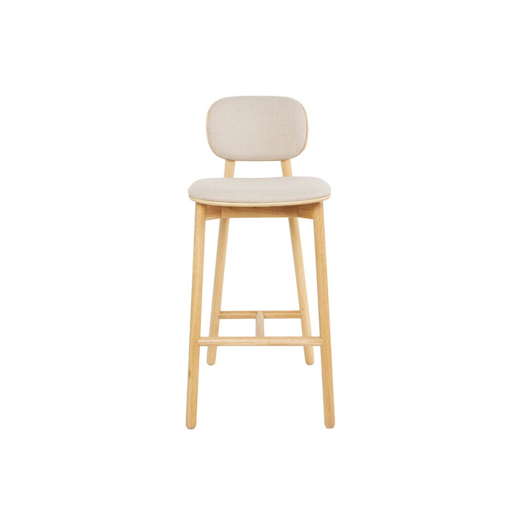 Sleek white bar stool with linen cushion and sturdy rubber wood legs. Its modern design and supportive seat make it an elegant, practical choice for kitchens or breakfast bars.