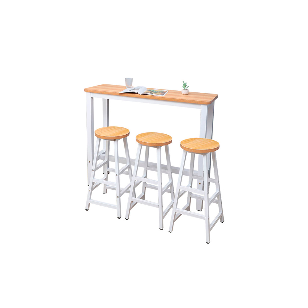 This bar table set features a light oak finish with durable MDF surfaces and sturdy metal frames, offering a cohesive, stylish, and long-lasting addition to any kitchen or dining area.
