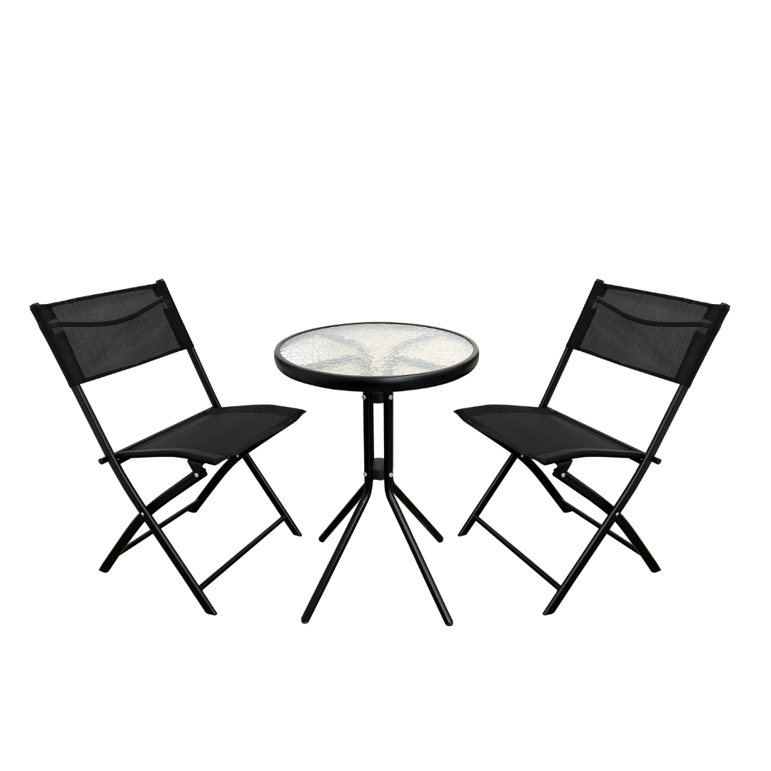 Crafted with durable steel frames and textilene fabric, the chairs offer both strength and comfort, while the table's tempered water wave glass top adds a touch of elegance and is easy to clean. Compact and weather resistant, this set is ideal for enjoying morning coffee or evening chats outdoors.