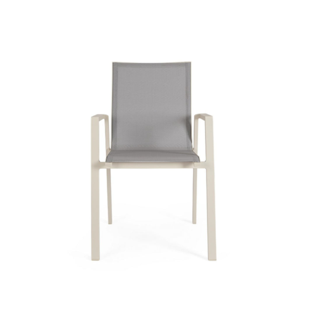 Stackable aluminium chair with armrests, powder-coated for durability and featuring a comfortable Textilene backrest and seat. Lightweight, modern, and ideal for indoor or outdoor use.