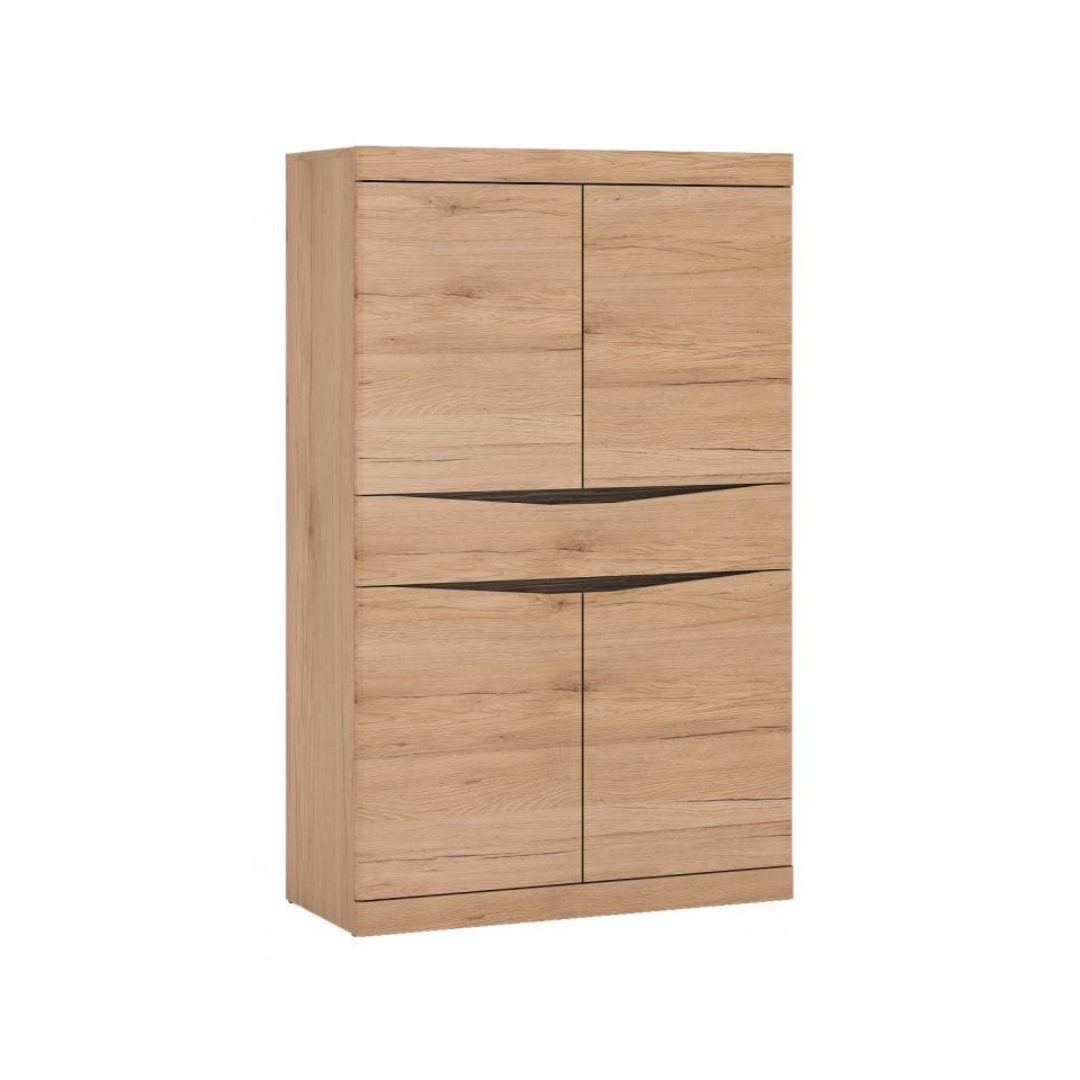 Enhance your storage with this sophisticated chest of drawers in San Remo & Arusha Wenge. Boasting four spacious shelves behind full fronts and a smoothly sliding drawer, it provides ample room for clothing, accessories, and household essentials.