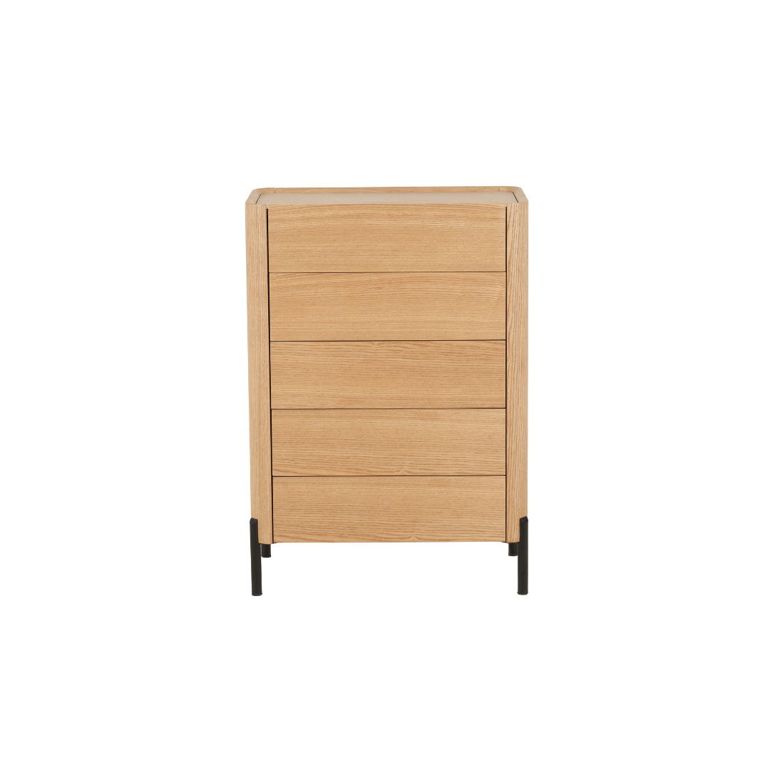 Modern black veneer chest with five spacious drawers and sturdy metal legs. Durable MDF build and easy assembly design deliver practical, stylish storage for bedrooms or living spaces.