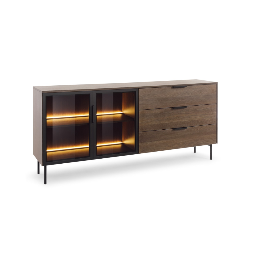 Elegant dunin oak chest of drawers with tempered glass fronts, black metal legs, and integrated LED lighting. Features two doors, three drawers, and full-extension slides for practical, stylish storage.