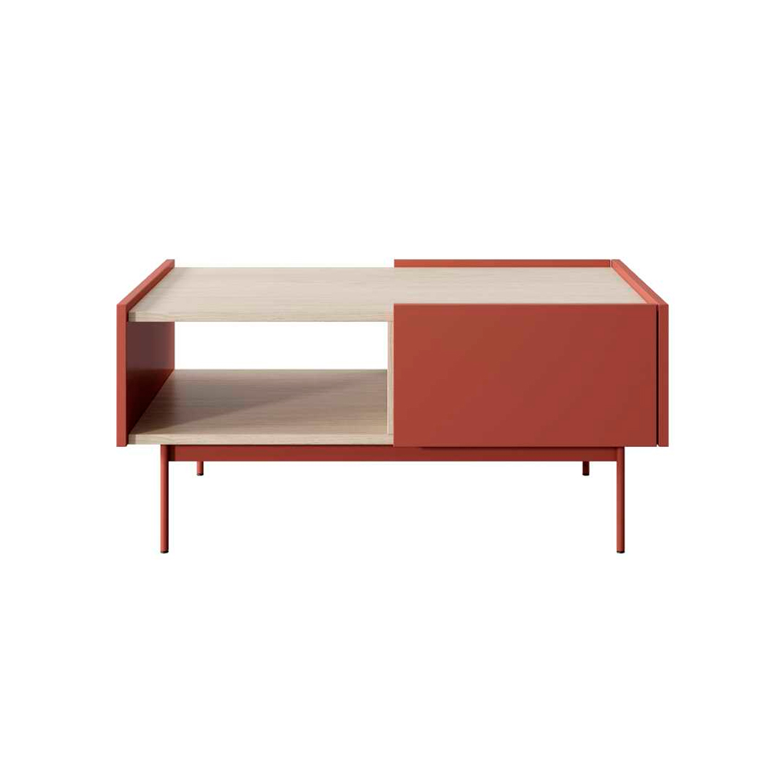 Add a striking accent to your living area with this coffee table in brick red ceramic and oak linea. The modern, minimalist silhouette is elevated by 20 cm high powder-coated metal legs, bringing both style and stability to your space. The warm brick red finish and natural oak linea details create a harmonious blend of elegance and contemporary design.