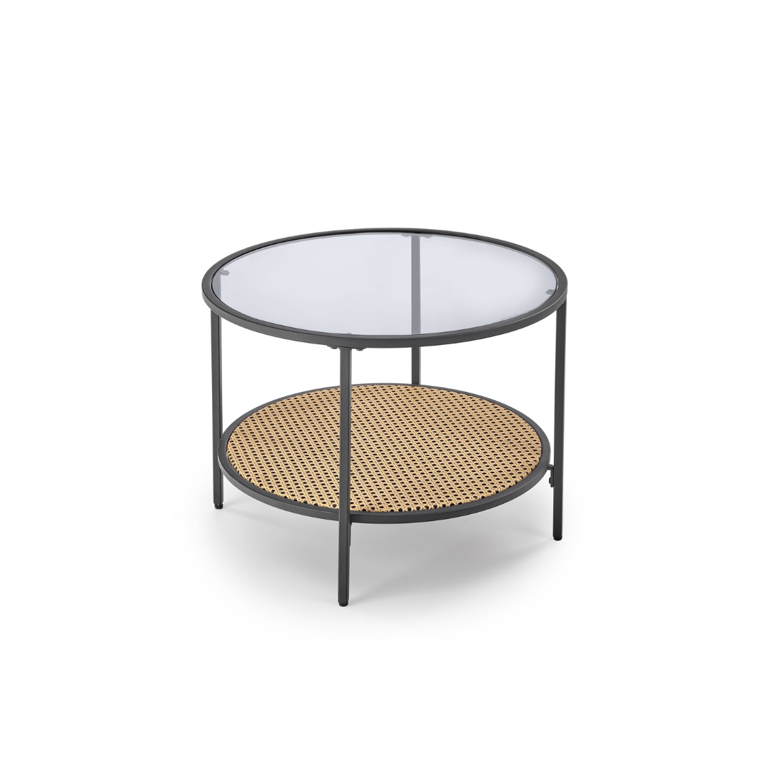 Round coffee table with a smoked glass top, natural synthetic rattan details, and a black powder-coated metal frame. Modern boho style with a matt finish adds unique character to any living space.