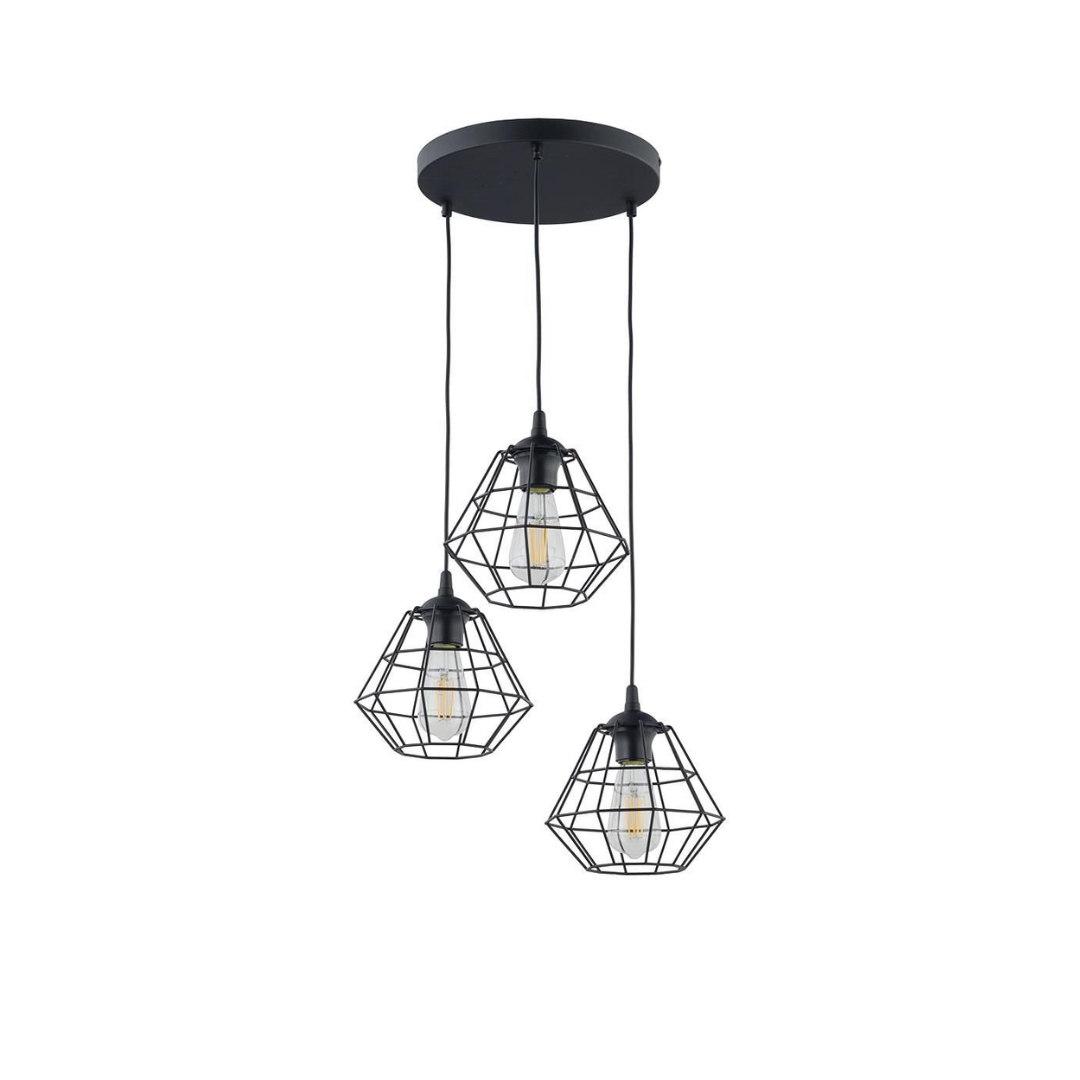 Modern black hanging lamp with three lights in an industrial style. Adjustable height, metal and plastic construction, and E27 sockets for versatile home lighting.