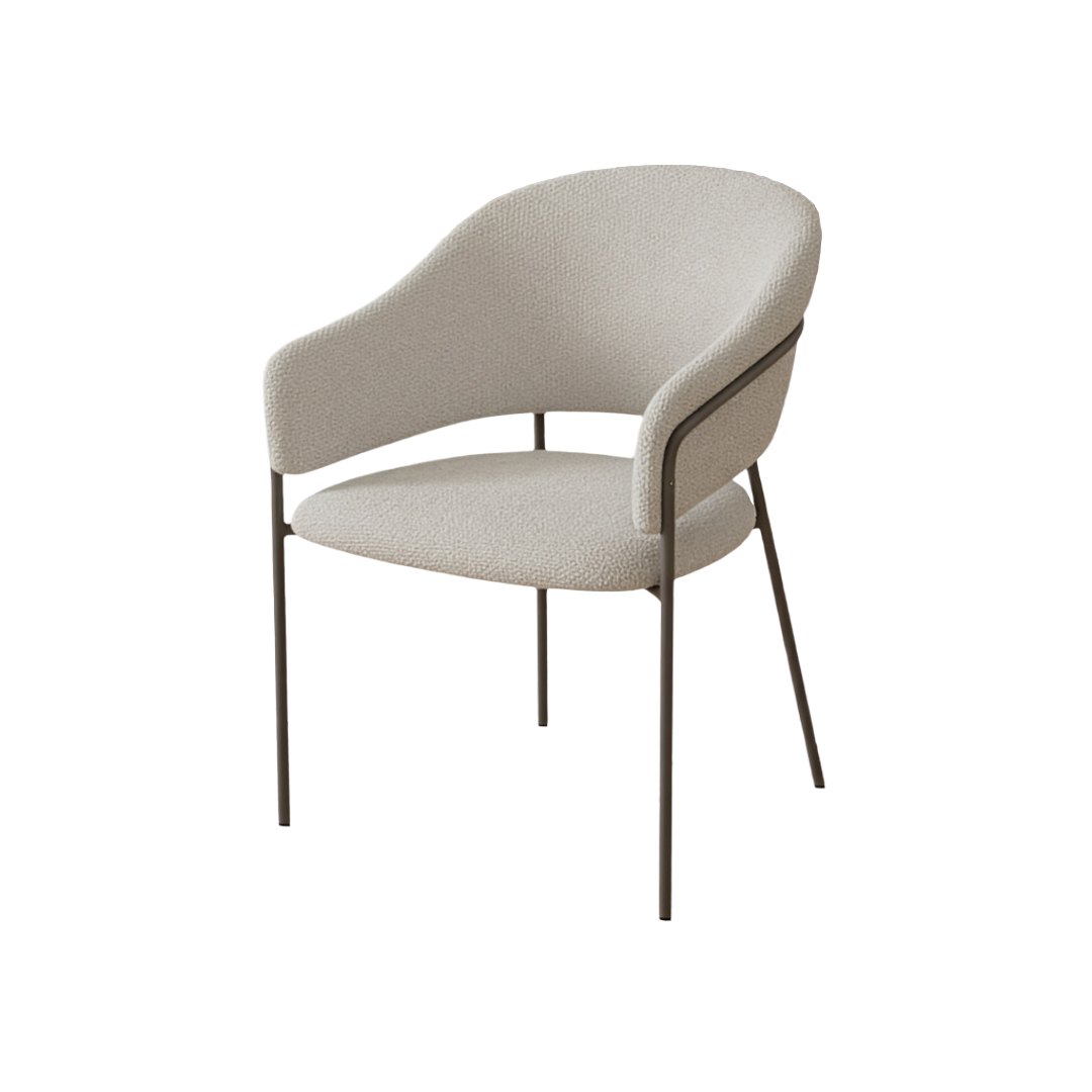 Modern dining chair with padded fabric seat and back in beige. Sturdy powder-coated metal frame ensures comfort and durability for everyday dining.