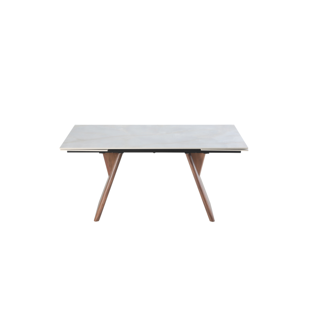 Modern dining table with Turkish White Jade ceramic top, walnut veneer plywood frame, and versatile extension for extra guests. Sleek design, durable build, and stylish matt finish.