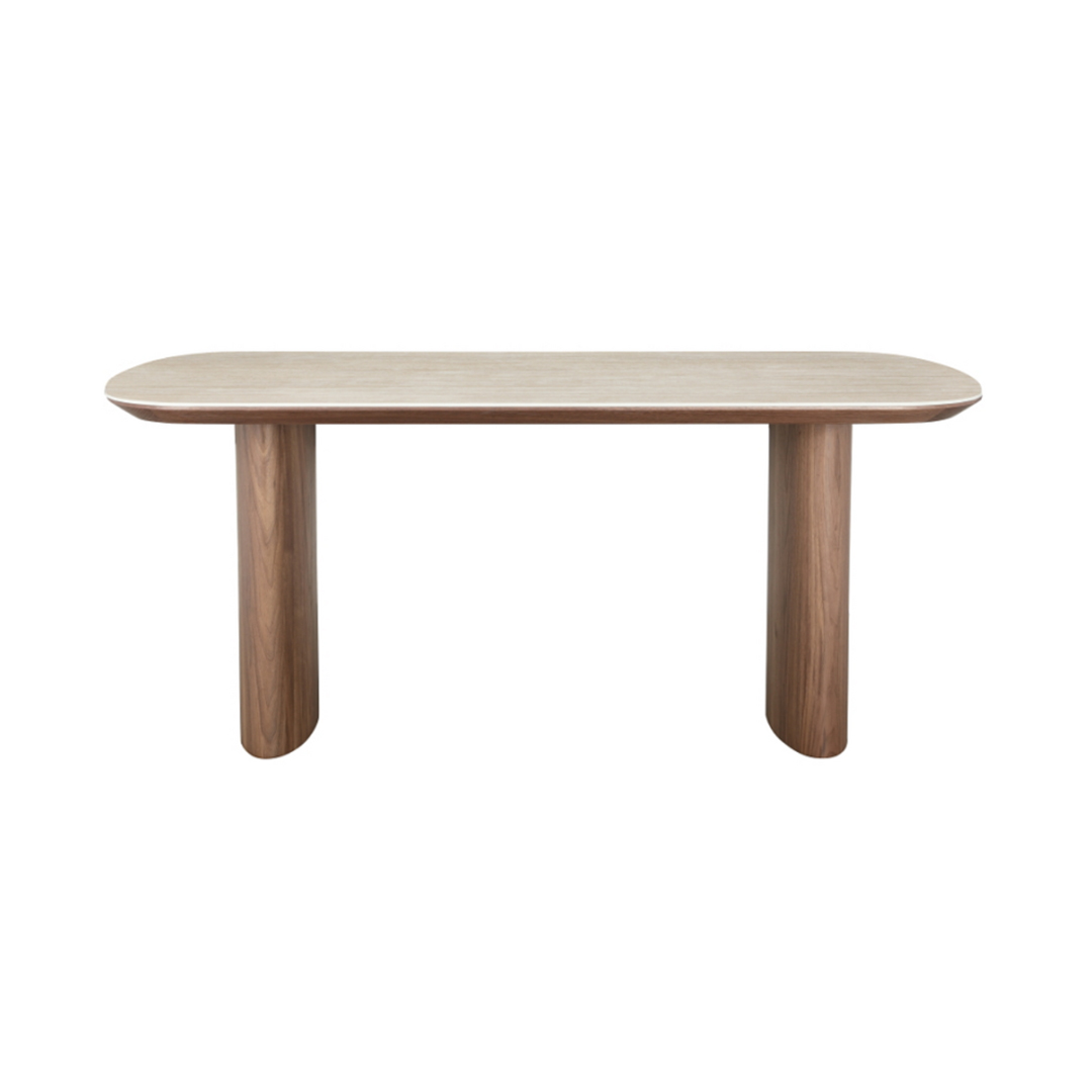 Dimensions: 1795 × 895 × 750 mm Material: Top: MDF with natural walnut veneer and 6 mm Travertine sintered stone Legs: MDF with natural walnut veneer
