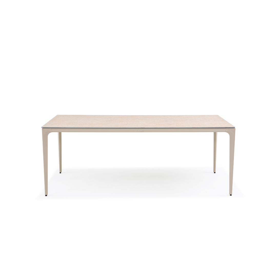 The robust aluminium tube base is powder coated in matt camel, providing stable support and a subtle touch of warmth. Adjustable foot caps ensure a level setup on any surface, making this table a versatile centrepiece for your modern dining room.