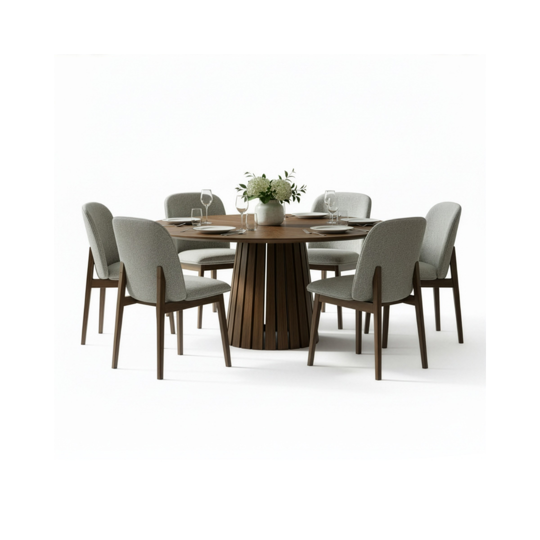Elegant round walnut dining table with slatted base and modern light grey upholstered chairs. Perfect blend of comfort, durability, and sophisticated style for any dining space.