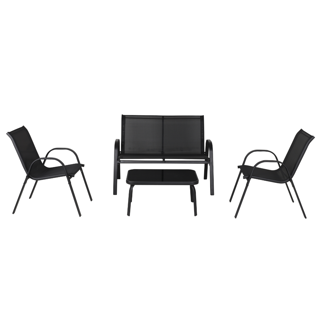 Contemporary 4 piece garden sofa set in black aluminium with textilene seating and tempered glass table. Durable, stylish, and easy to maintain for modern outdoor living.