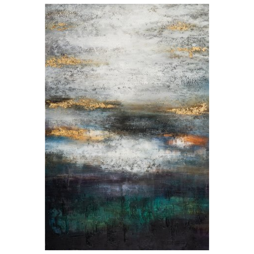 Add a touch of contemporary sophistication to your space with the "Grey-Green Abstract" acrylic painting. Featuring a harmonious blend of grey and green tones, this artwork invites personal interpretation while creating an atmosphere of depth and elegance. The skilled hand-painted design is further enhanced with light-reflecting golden metal foil, making it a truly captivating focal point for any room.