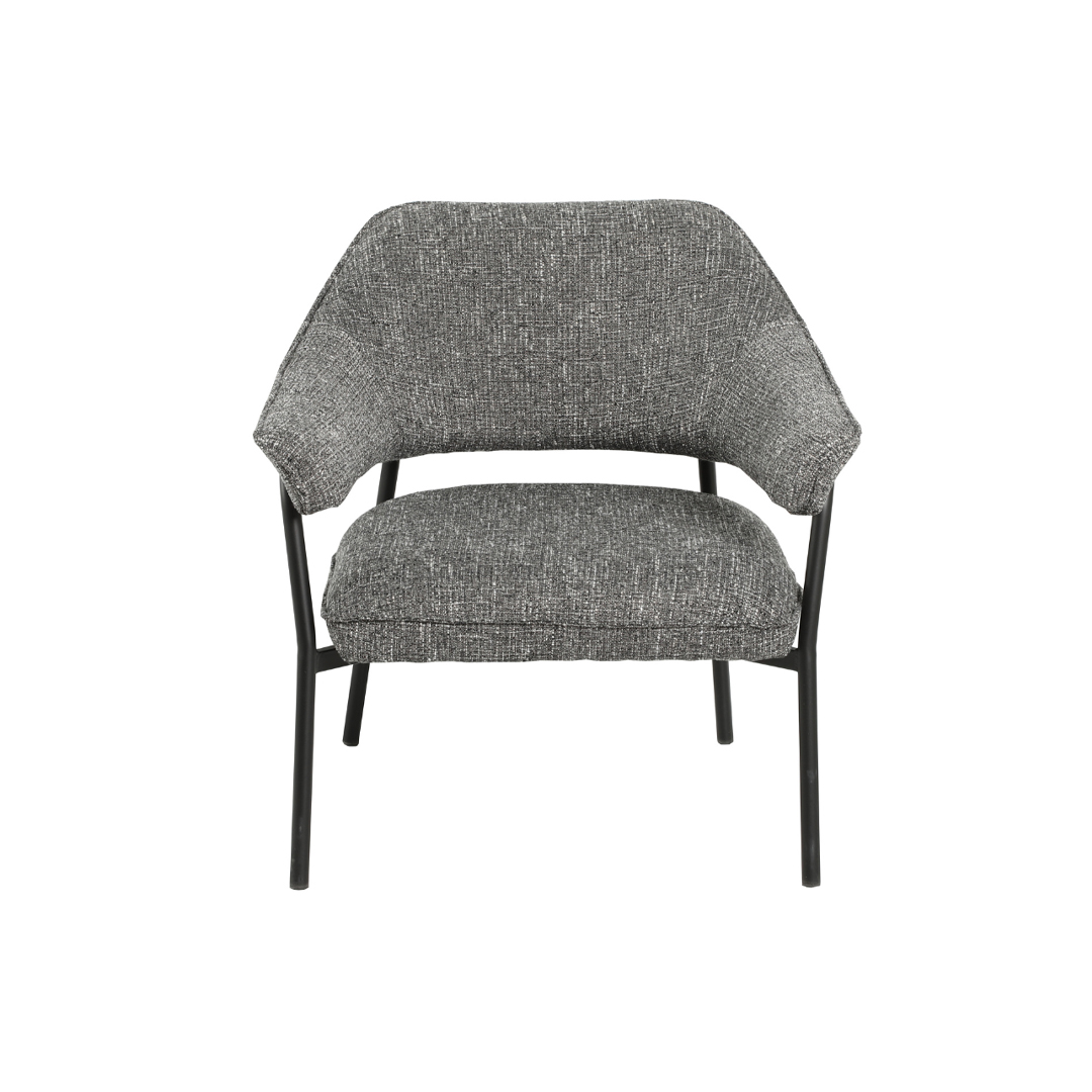 Contemporary lounge chair in dark grey OTE FIELD fabric with sturdy black metal legs. Compact design offers comfort and modern style, perfect for living rooms or office spaces.