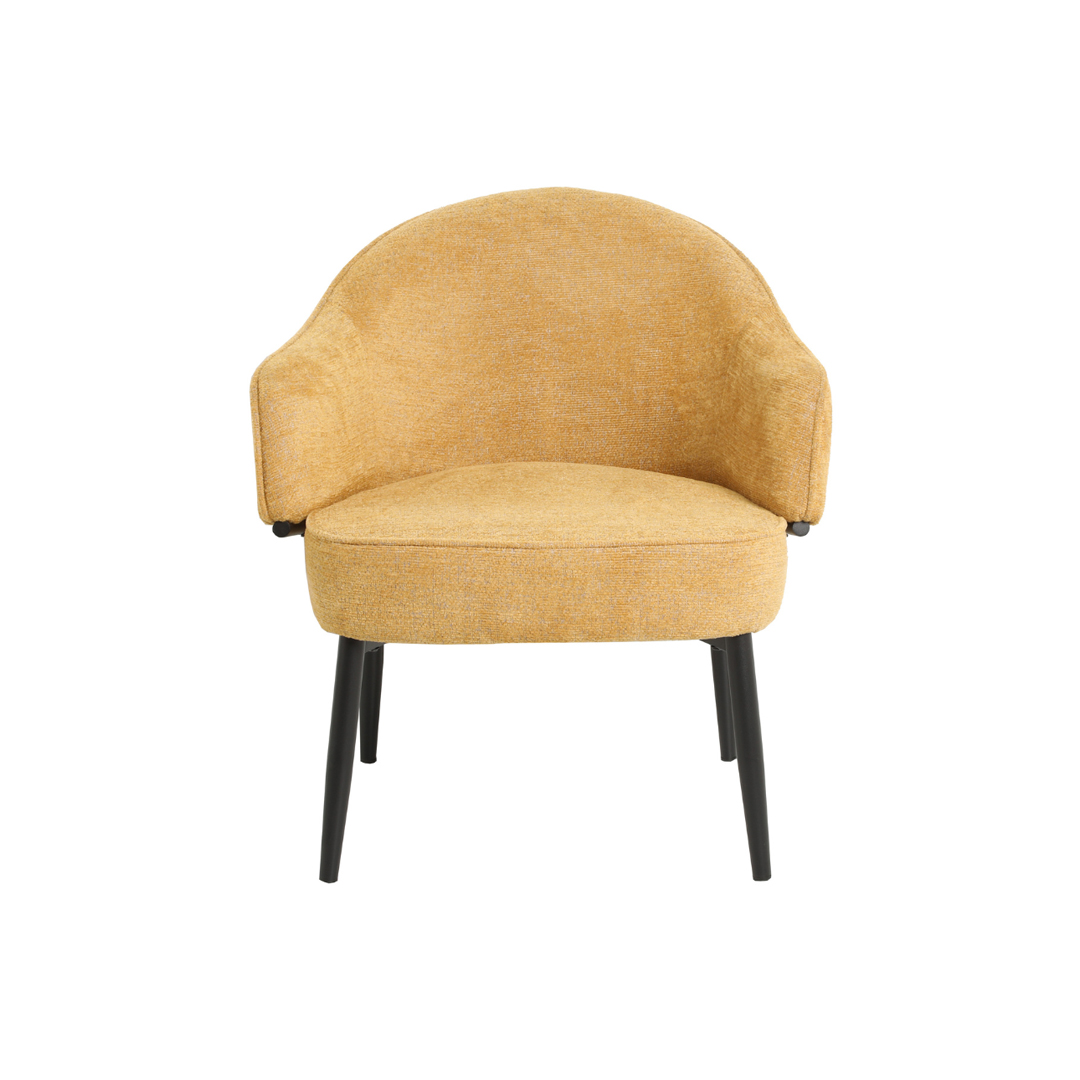 Modern yellow lounge chair with soft fabric upholstery and sturdy sanded black metal legs. Compact design brings comfort and vibrant style to any living space.