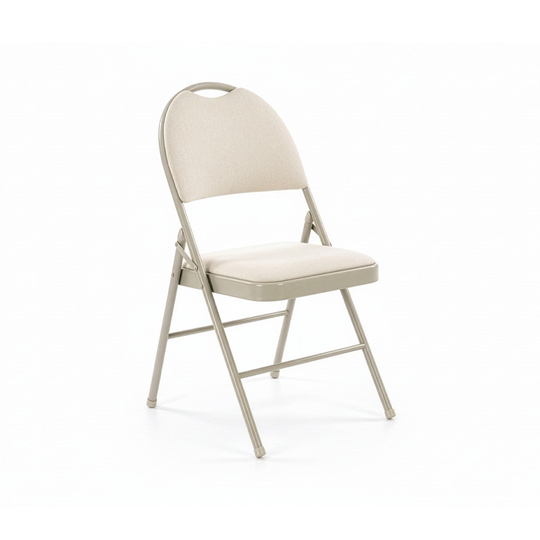 Scandinavian-inspired folding chair with beige fabric seat and sturdy powder-coated steel frame. Elegant, minimalist design offers comfort, space-saving folding, and versatile use for home or office.