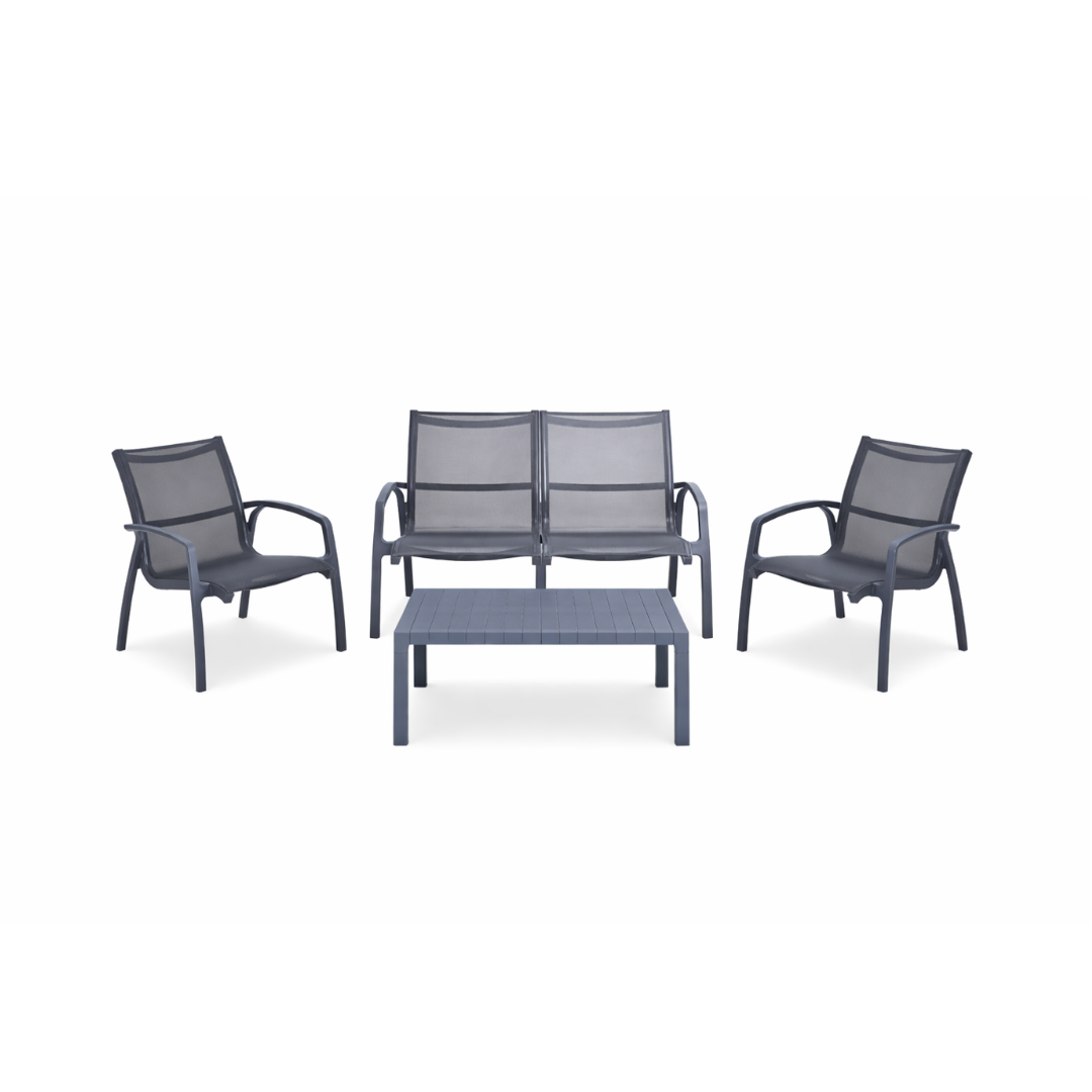 Modern outdoor sofa set in dark grey. Lightweight, weather-resistant polypropylene offers easy cleaning and versatile style for patios, gardens, or balconies.