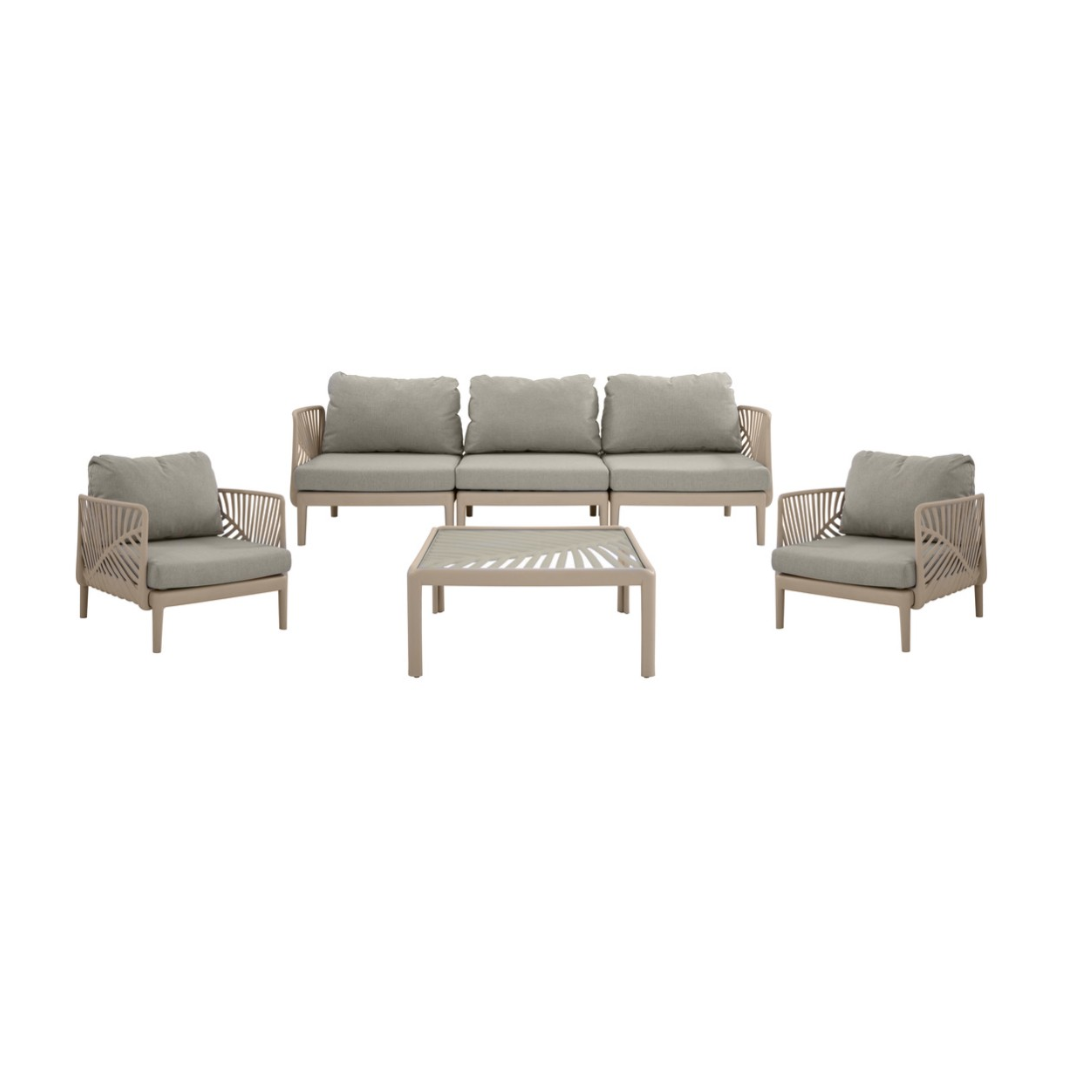Dimensions: Single Sofa W 76 x D 70 x H 74 cm 3-Seater Sofa W 221 x D 70 x H 74 cm Coffee Table W 69 x D 69 x H 32 cm Material: Polypropylene resin Colour: Taupe Cushions Material: Polyester (weather-resistant), Foam Cushinos Colour: Beige