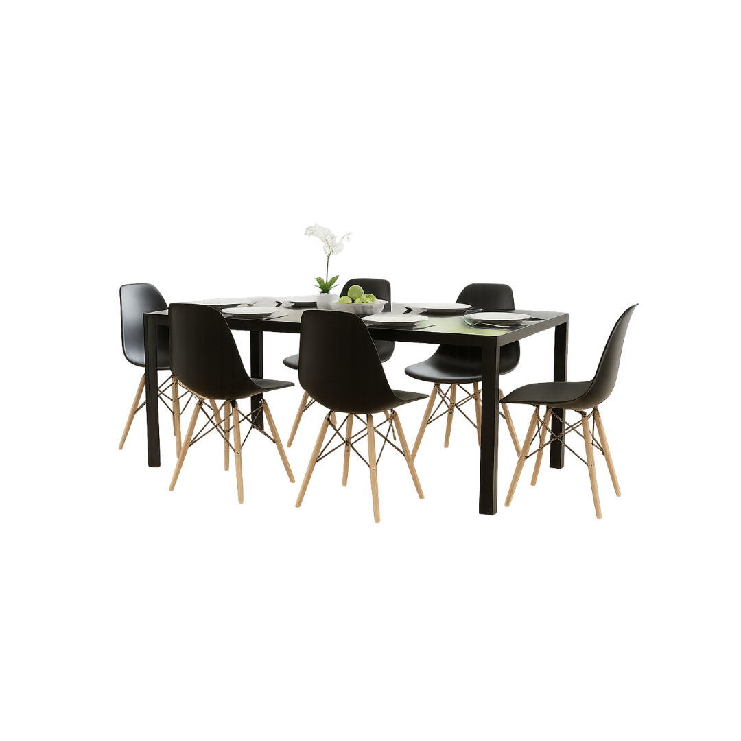 Elevate your dining space with this contemporary dining set, featuring a spacious table with a striking 8mm black tempered glass top and sturdy powder-coated metal legs. Its modern silhouette complements a range of interiors, offering both elegance and durability for everyday use or special occasions.