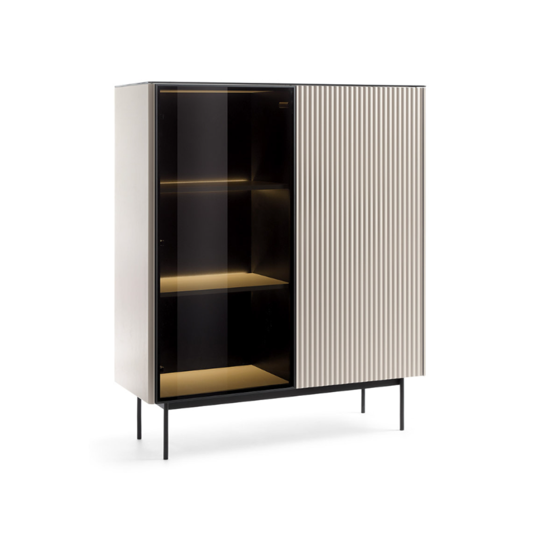 Modern showcase cabinet in Vicenza oak with integrated LED lighting. Features ample display and storage space in a sleek, contemporary design to elevate any living or dining room.