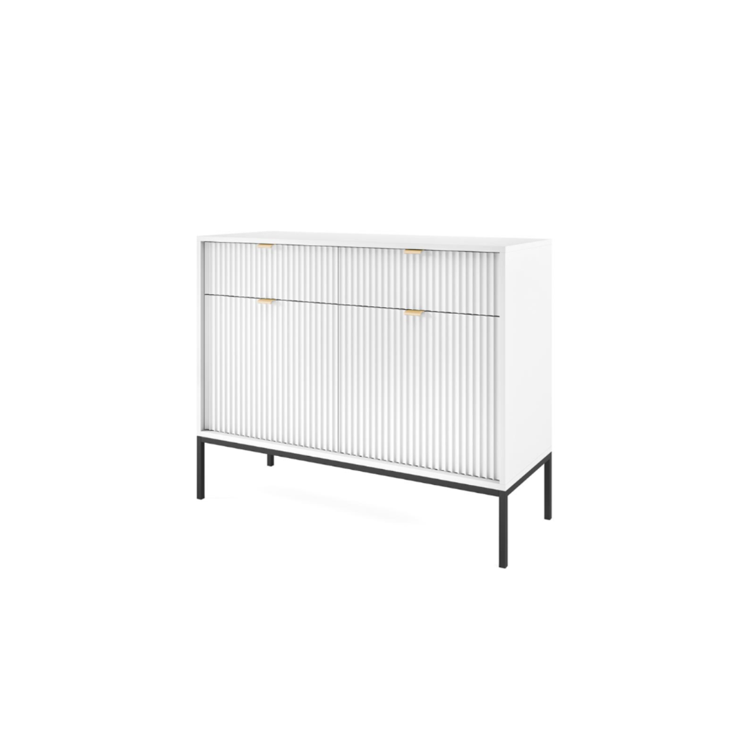 Dimensions: Width: 104 cm Depth: 39 cm Height: 83 cm Material: Front: 18 mm grooved MDF Body: 16 mm laminated board Edge Finish: ABS reinforced Handle: Aluminum Legs: Powder-coated steel frame Storage: 2 Drawers + Shelves Colour: White