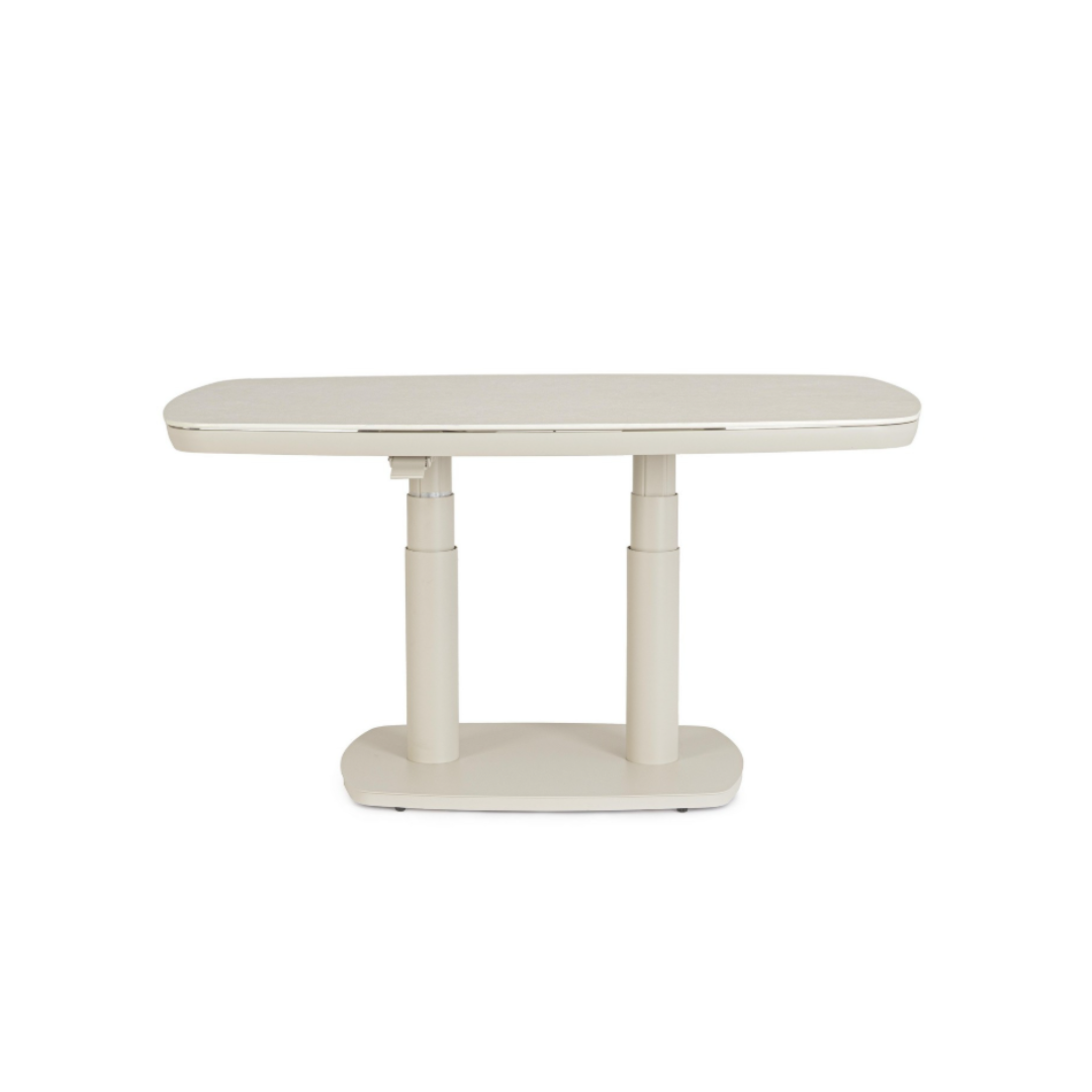 Contemporary table with height-adjustable design, featuring a powder-coated aluminium frame and durable sintered stone top. Ideal for adaptable living spaces indoors or outdoors.