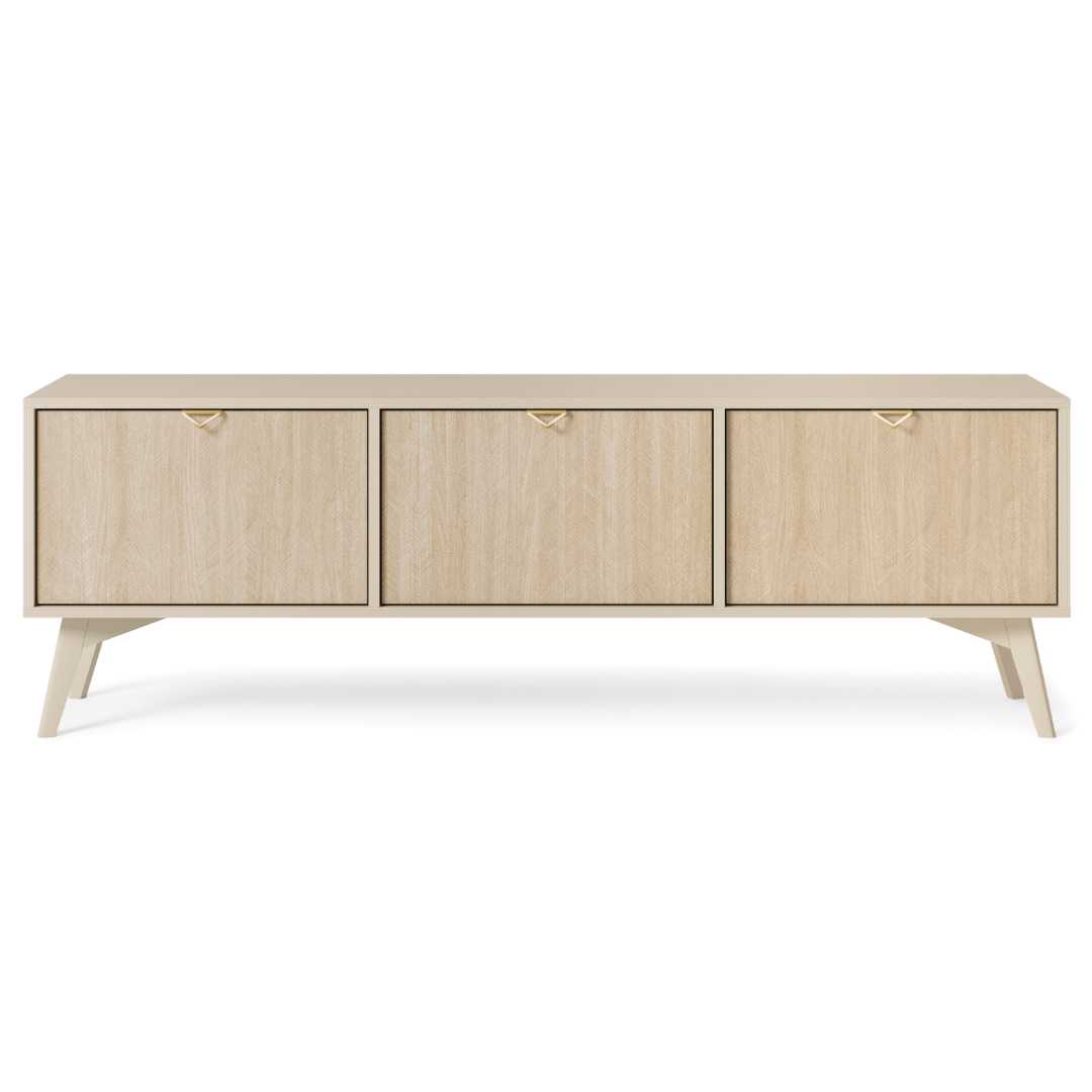 Modern TV cabinet in beige sand with gold aluminium handles and beech wood legs. Features three hinged flaps, space for electronics, and beige chevron scandi fronts.