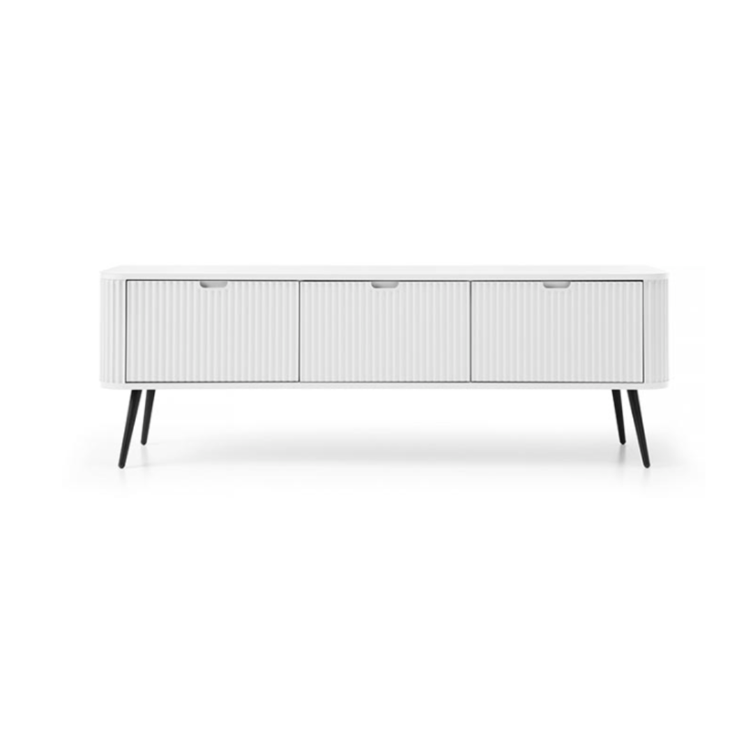 Sleek white TV unit featuring three spacious drawers for organised storage. Modern design with a wide surface, perfect for stylishly displaying your television and media accessories.