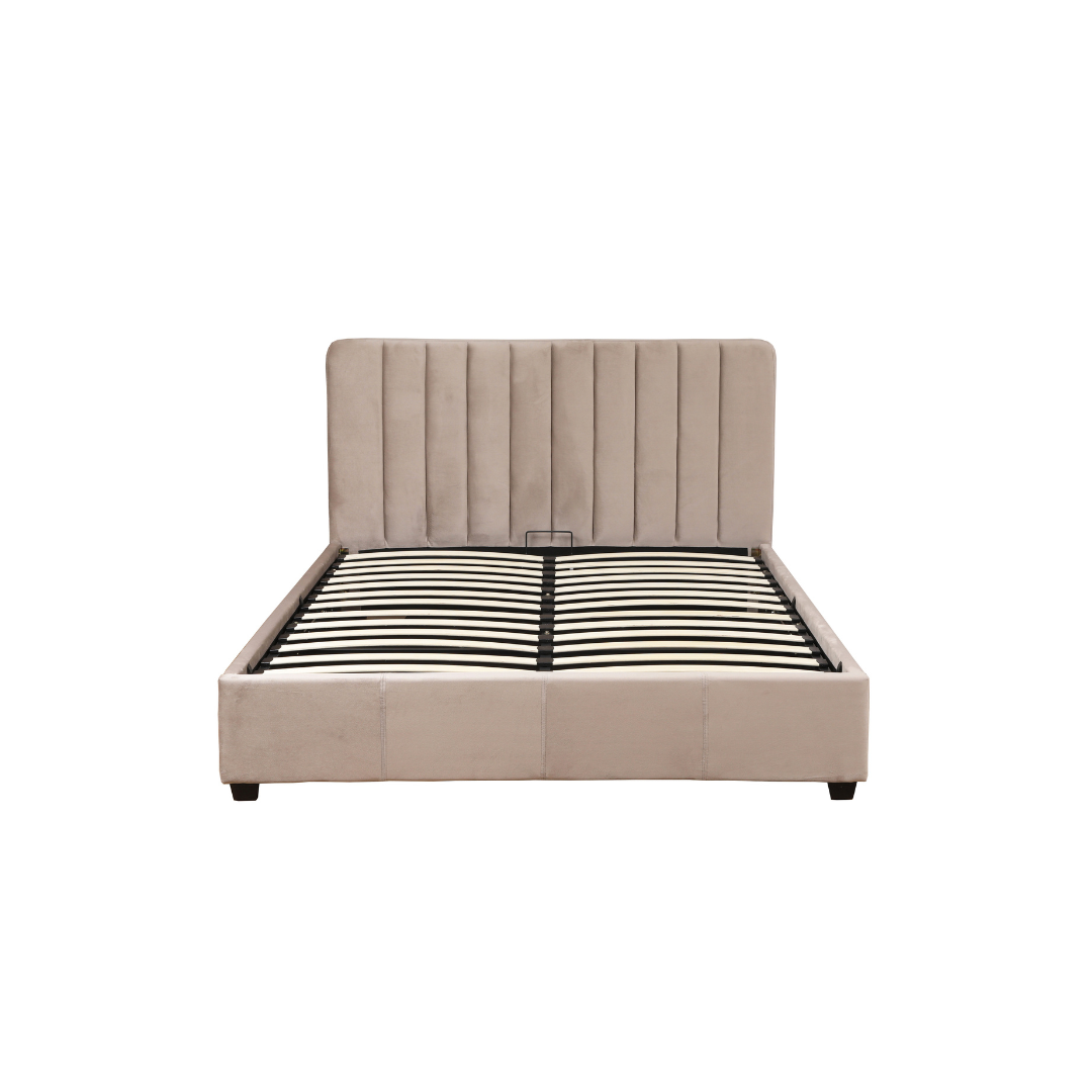 Light brown velvet upholstered bed frame with plush headboard, durable multi-plywood construction, and sturdy solid wood feet. Modern design ensures comfort and reliable mattress support.