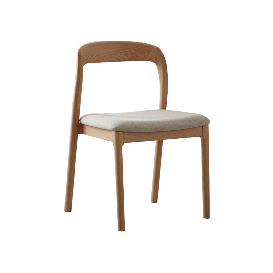 Elegant chair with plush fabric seat, high-density foam padding, and sturdy white wax wood frame. Modern design provides comfort and style, ideal for dining or accent seating.