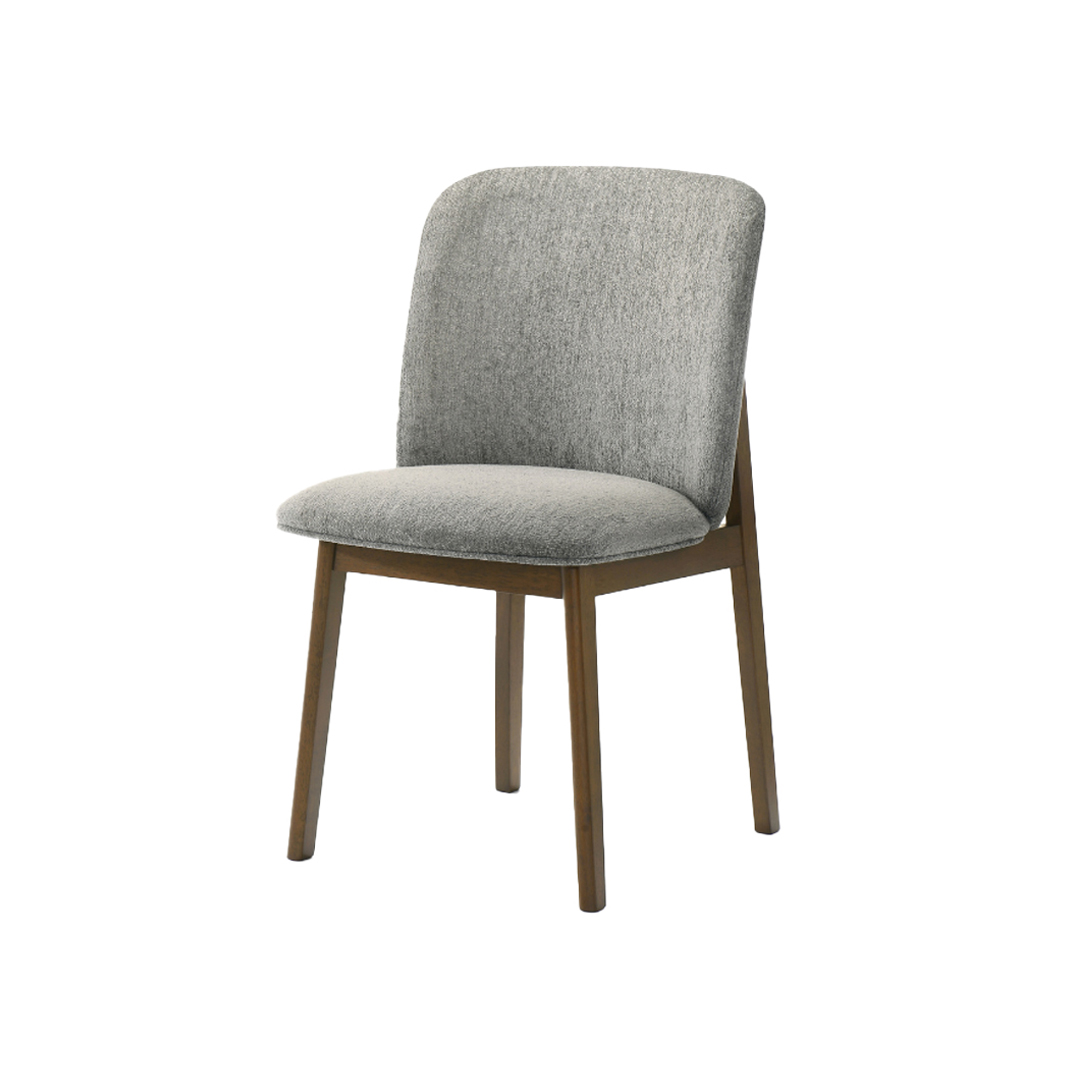Modern chair with cushioned fabric seat and high backrest, supported by sturdy walnut legs. Sleek, versatile design adds comfort and style to dining rooms or kitchens.