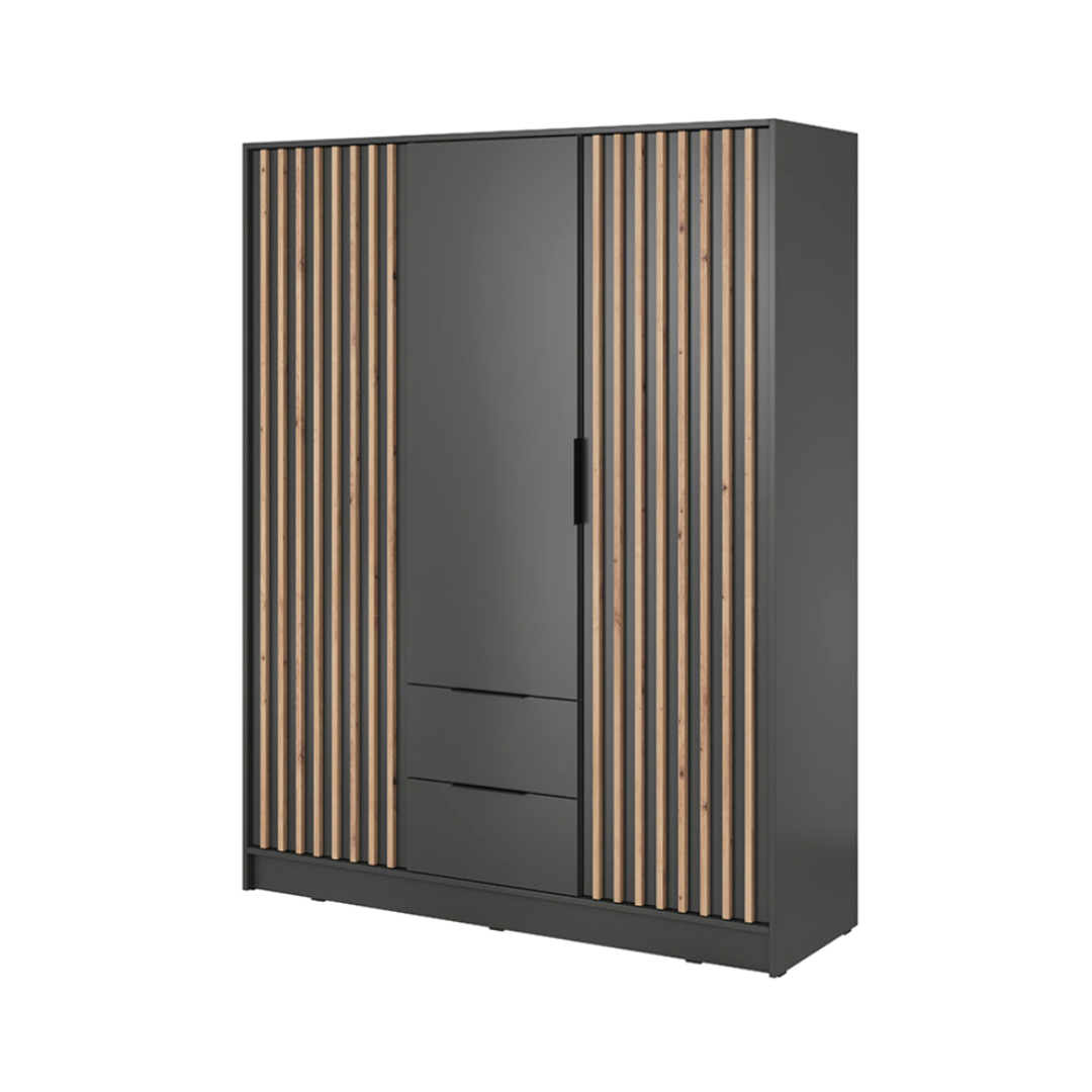 Add functional storage and contemporary style to your bedroom with this three-door wardrobe in a sophisticated oak and graphite finish. The spacious interior features both hanging space and shelving, making it easy to organise clothing and accessories.